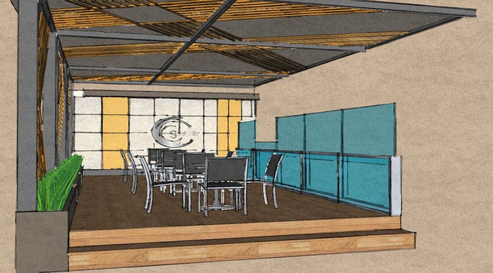 Dehor esporto al vento, protetto con BellaVista System, con pannello cieco inferiore.