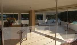 Vetrata con impacchettamento a lato, senza porte. Impacchettamento della vetrata lato montante. Anche senza guida a pavimento fino ad un massimo di 4 ante. Apertura interna o esterna. |