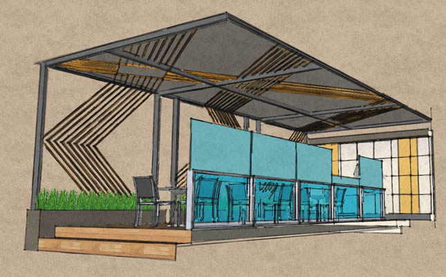 Progettato per proteggere i tavoli posizionati nei dehor sul suolo pubblico o su pedane, Bellavista System è provvisto di un sistema di fissaggio a staffe che permette una facile e rapida rimozione quando necessario.